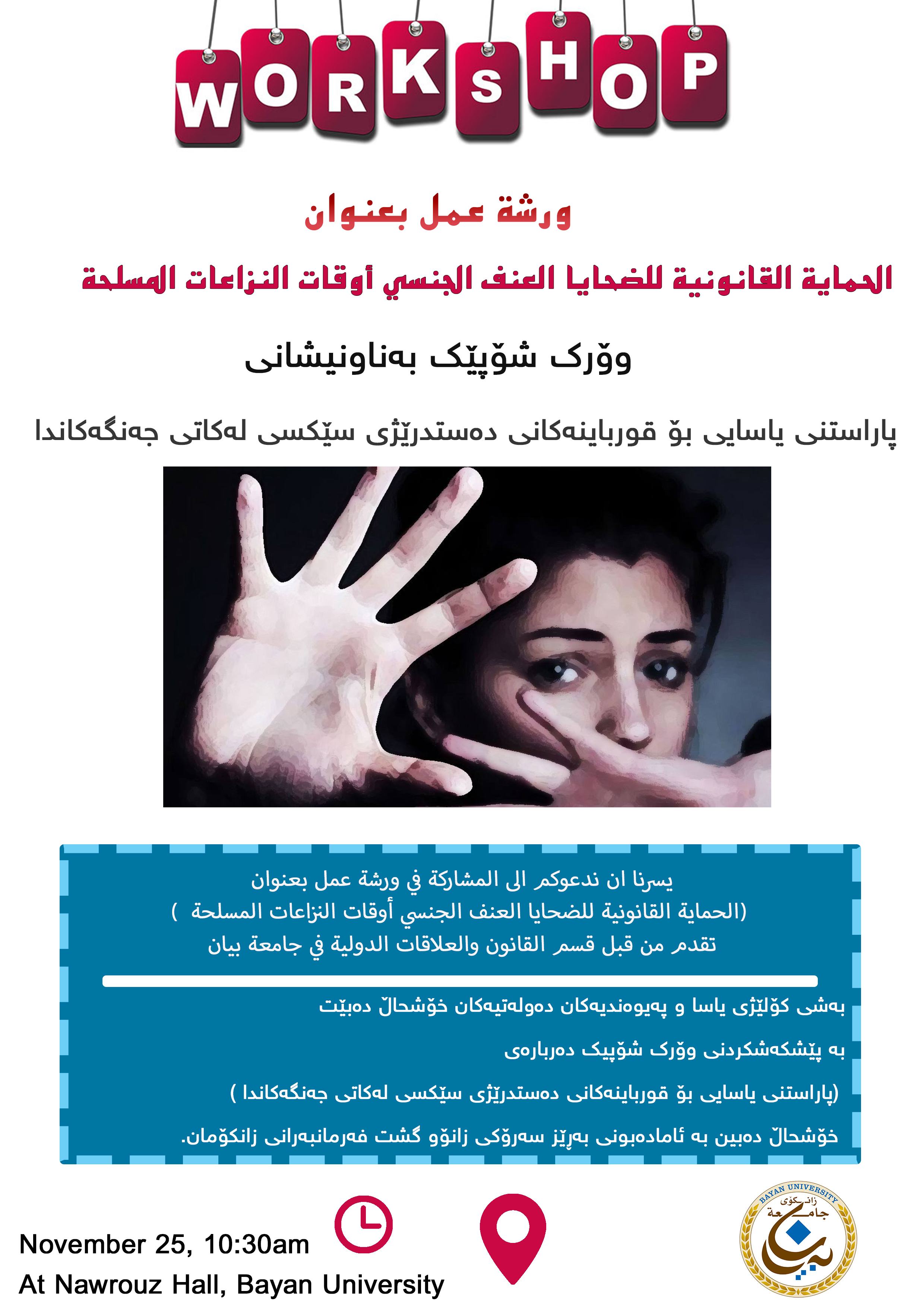بەشی کۆلێژی یاسا و پهیوهندیهکان دهولهتیهکان خۆشحاڵ دەبێت بە پێشکەشکردنی وۆرک شۆپیک دەربارەی (پاراستنی یاسایی بۆ قورباینەکانی دەستدرێژی سێکسی لەکاتی جەنگەکاندا )