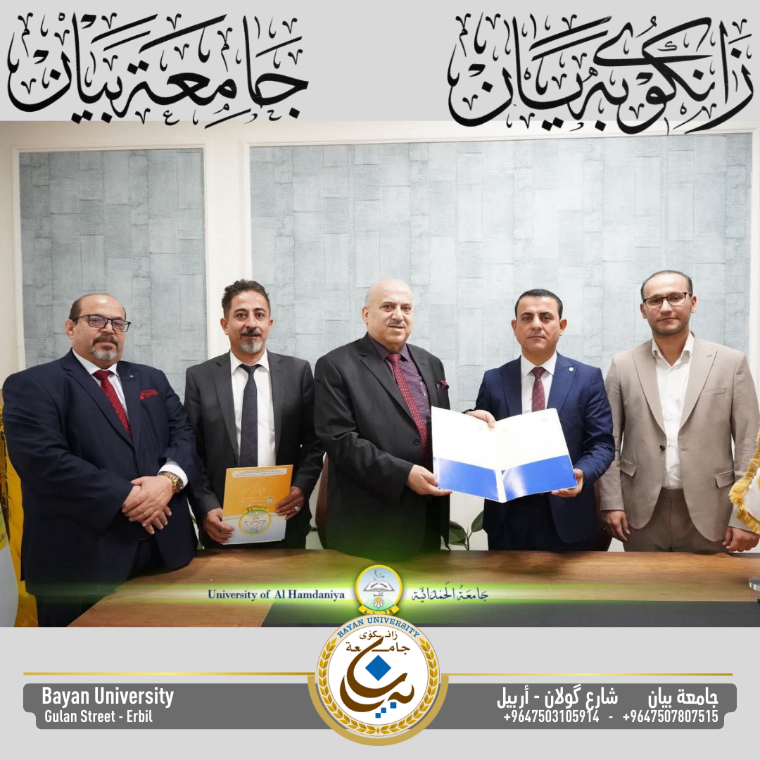 The agreement was signed by Professor Dr. Nashat Slewa, President of the University, and Dr. Abdulsalam Al-Hayali, Chairman of the Board of Trustees at Bayan University, in the presence of Assistant President of Bayan University, Assistant Professor Dr. Aras Ismail Khader.